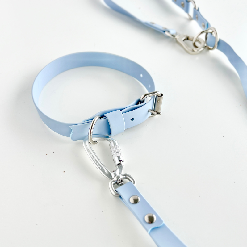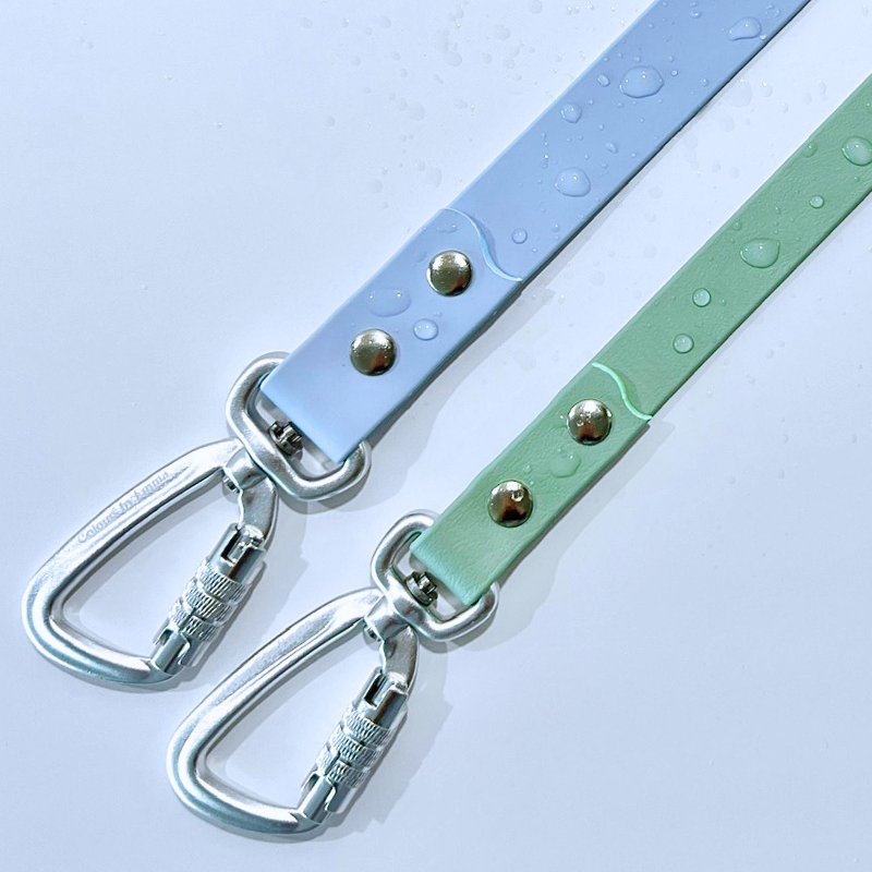 All other colours available for our leashes and collars use a material called BioThane, developed by the BioThane company.