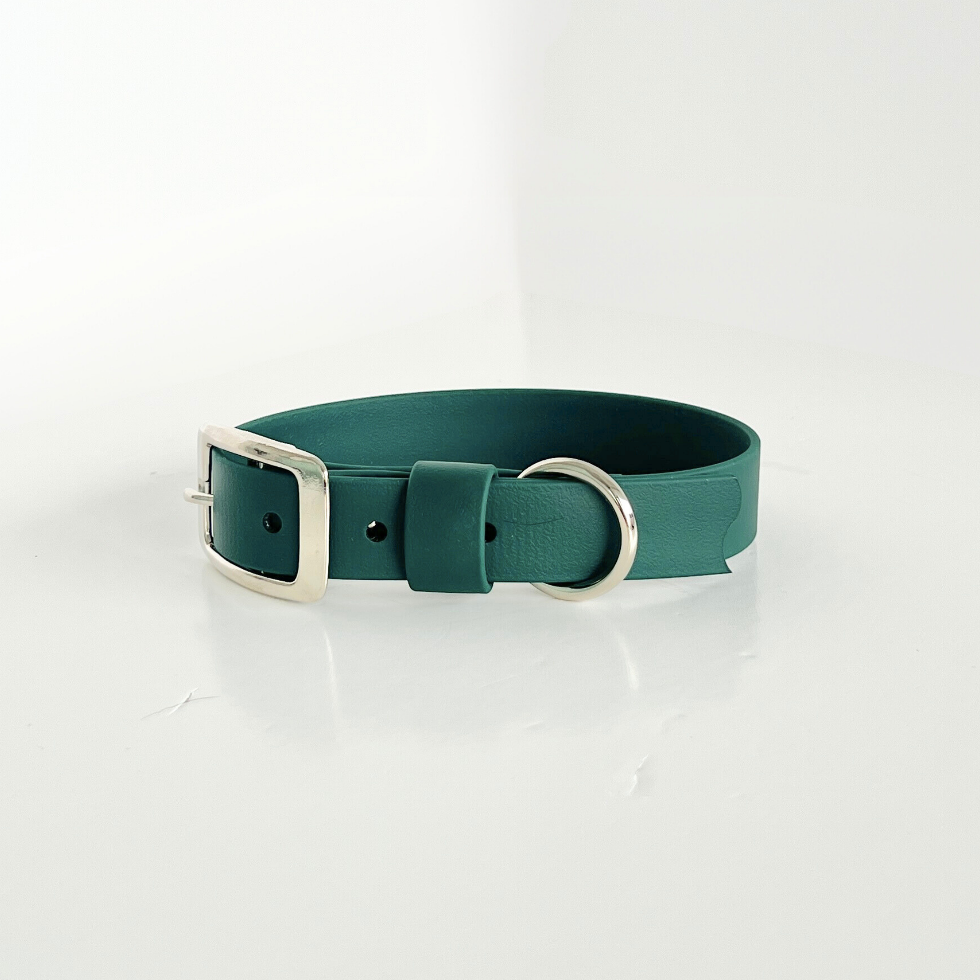 The Original Collar, our minimalist and weather-proof dog collar, in FOREST GREEN. It's waterproof, odour and grime resistant, making it incredibly easy to keep clean. Whether a casual walk in the city, or a adventurous hike through nature, these durable collars will hold up against the elements. Plus, they're intentionally minimalist to pair well with almost any outfit and gear.
