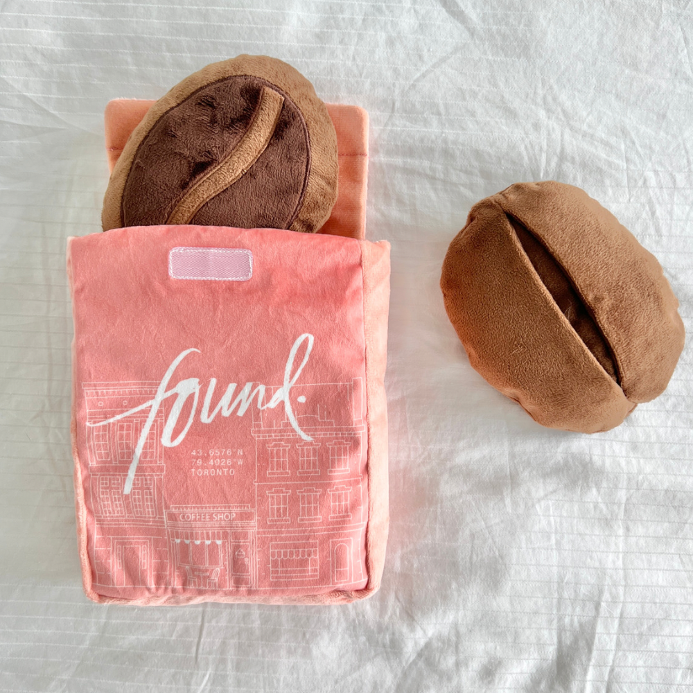 An exclusive collaboration between Found Coffee x Colours By Emma. With crinkles, squeakers, and treat pockets, your morning coffee just got so exciting for your dog! It's an enrichment toy to work the senses, as your dog scavenges for the treats hidden in the pockets of the beans.
