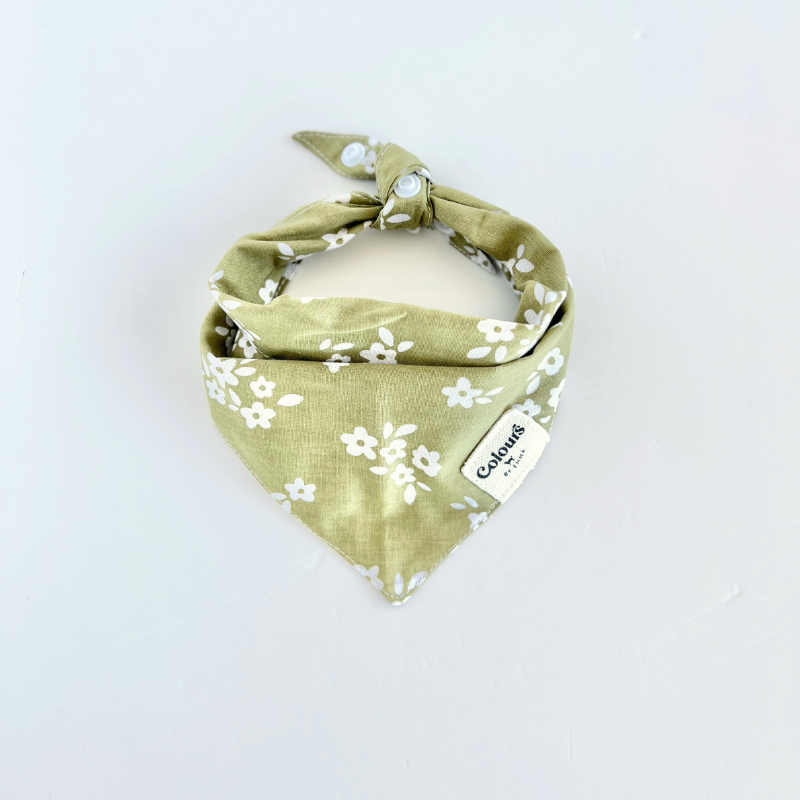 Matilda Dog Bandana in an olive green floral pattern to complete your look!