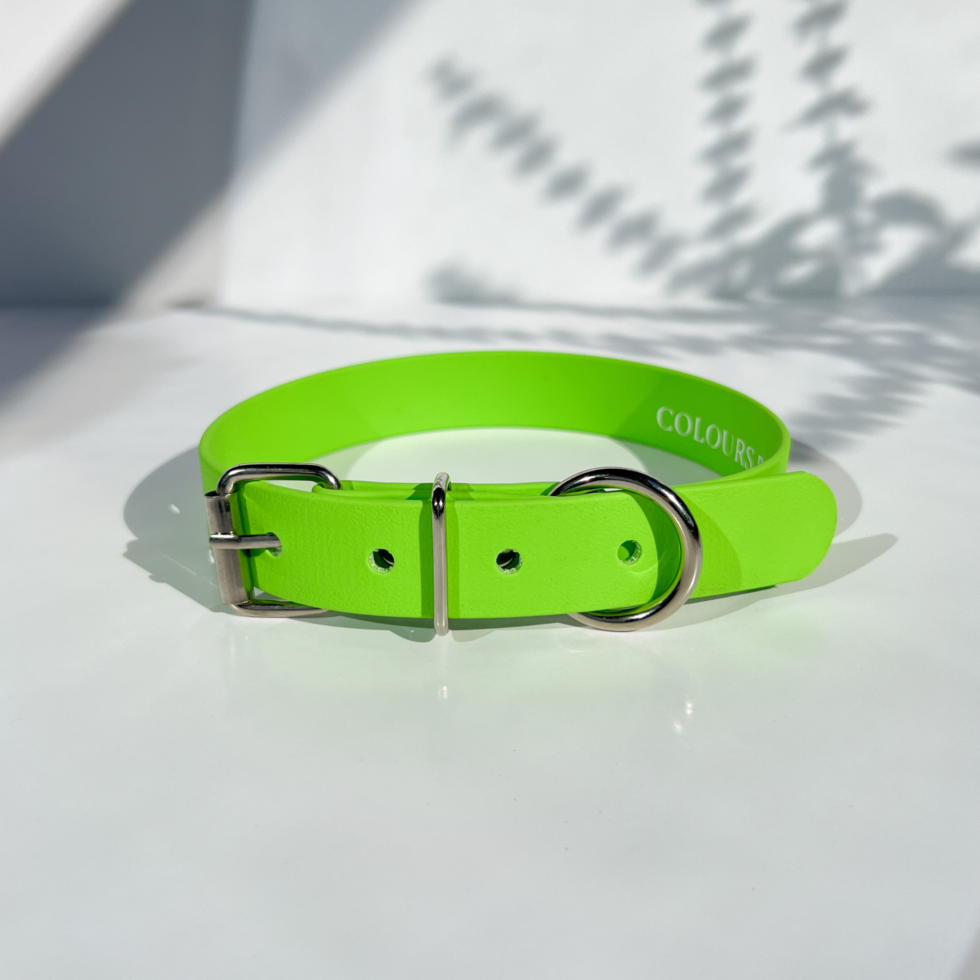 Collars come in two widths, 1" and 3/4", and in various neck sizes. Pick a colour to match your leash, or that windbreaker you use on your morning runs!