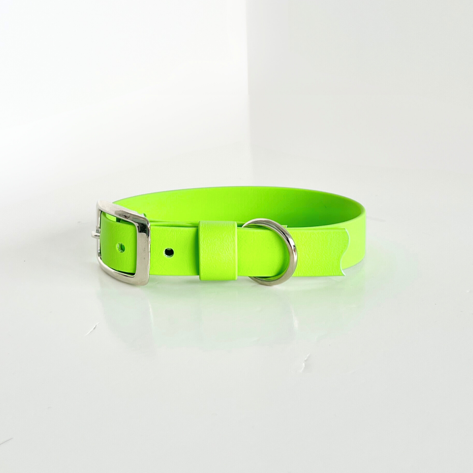 The Original Collar, our minimalist and weather-proof dog collar, in NEON GREEN. It's waterproof, odour and grime resistant, making it incredibly easy to keep clean. Whether a casual walk in the city, or a adventurous hike through nature, these durable collars will hold up against the elements. Plus, they're intentionally minimalist to pair well with almost any outfit and gear.
