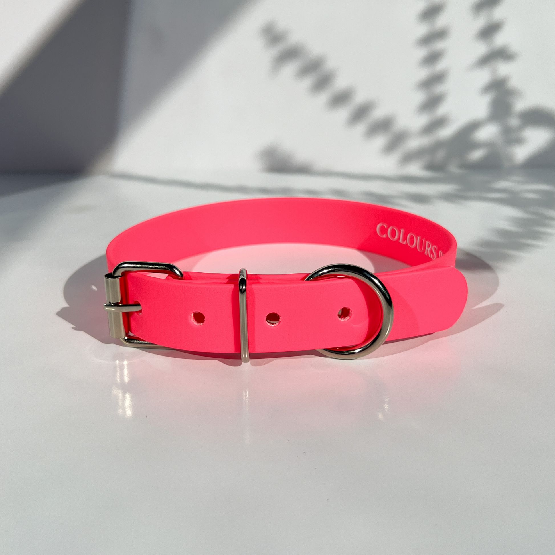 Collars come in two widths, 1" and 3/4", and in various neck sizes. Pick a colour to match your leash, or our pink bows!