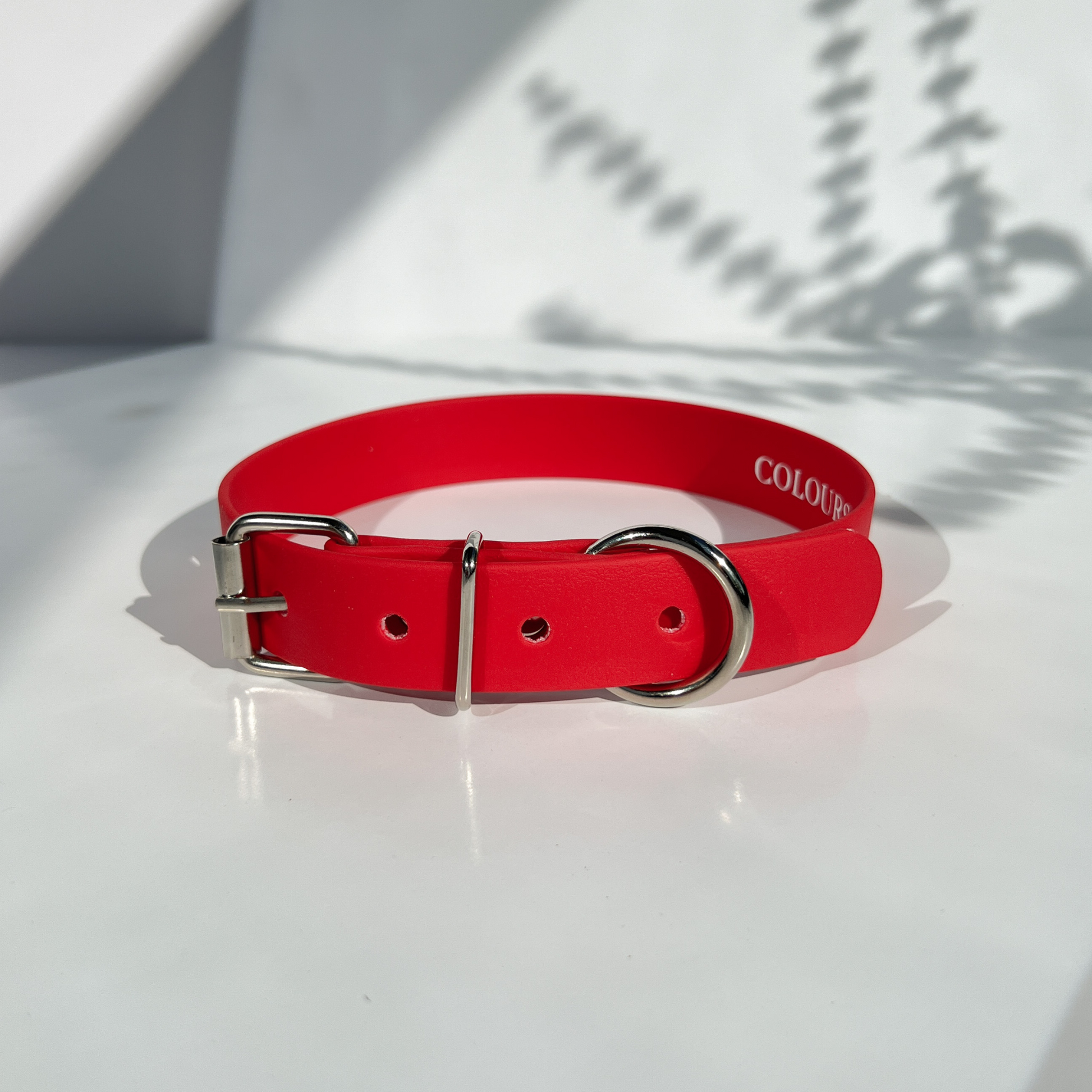 Collars come in two widths, 1" and 3/4", and in various neck sizes. Pick a colour to match your leash, or that red phone protector case you use!