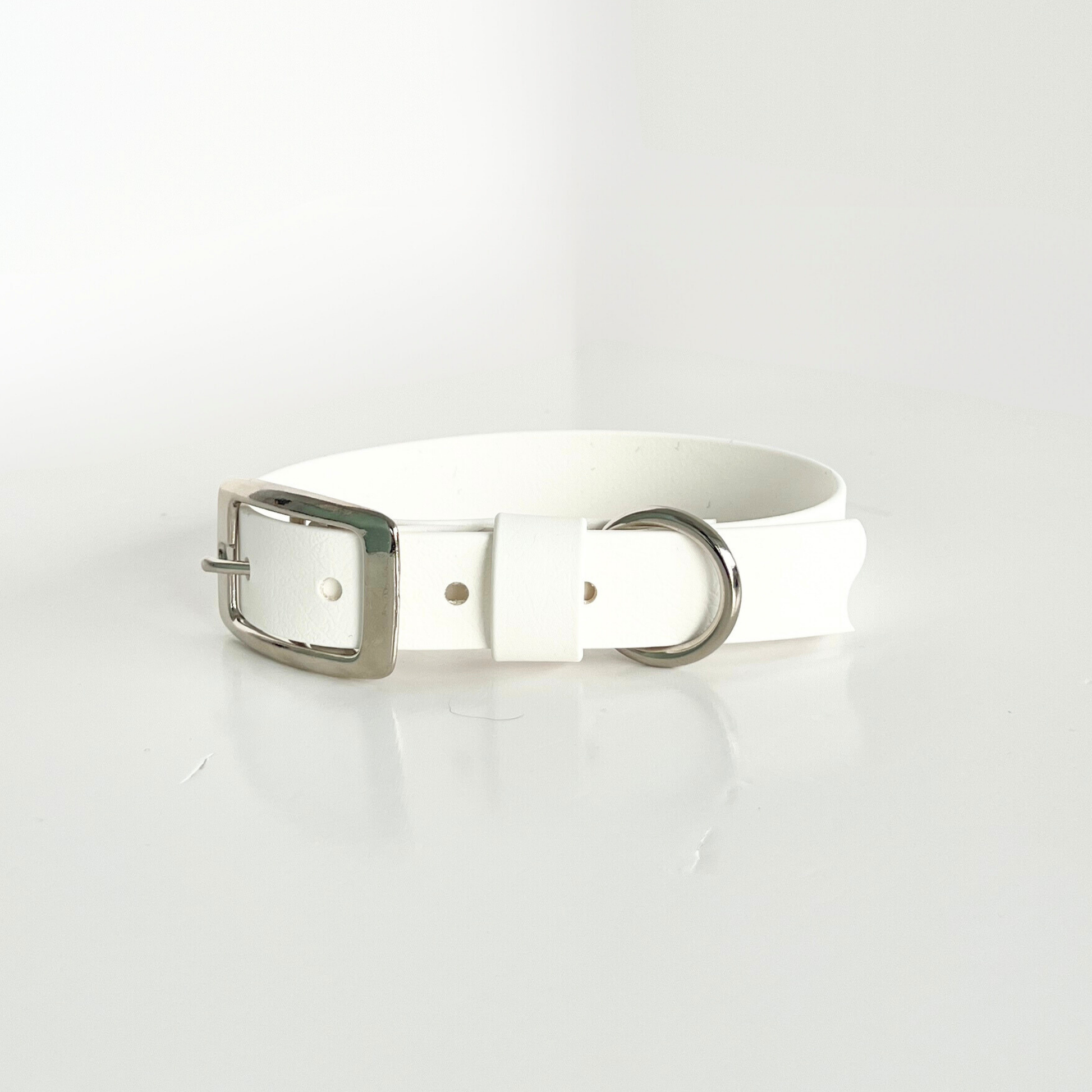 The Original Collar, our minimalist and weather-proof dog collar, in WHITE. It's waterproof, odour and grime resistant, making it incredibly easy to keep clean. Whether a casual walk in the city, or a adventurous hike through nature, these durable collars will hold up against the elements. Plus, they're intentionally minimalist to pair well with almost any outfit and gear.