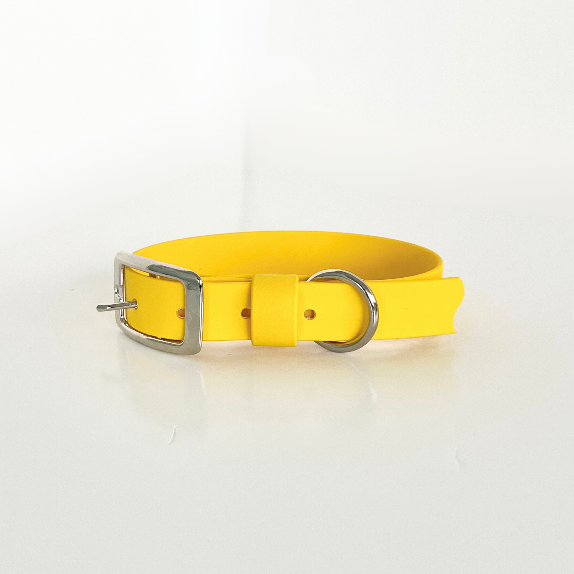 The Original Collar, our minimalist and weather-proof dog collar, in YELLOW. It's waterproof, odour and grime resistant, making it incredibly easy to keep clean. Whether a casual walk in the city, or a adventurous hike through nature, these durable collars will hold up against the elements. Plus, they're intentionally minimalist to pair well with almost any outfit and gear.